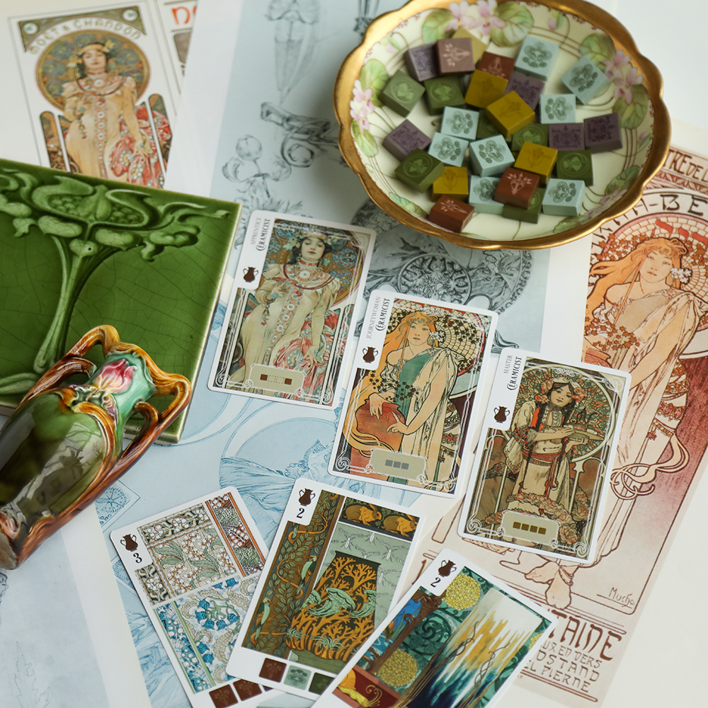 Linen finishes, durable materials, and a fine attention to detail make this game a tactile experience on par with the extravagant books and art of the Art Nouveau era.