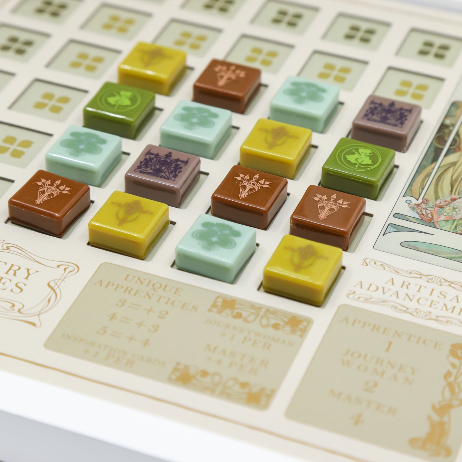 Each round players will take turns using their artisans to draft material tiles in specific shapes from the market and using those tiles to craft patterns for renown. As each player crafts more patterns, they will gain new artisans or advance their existing artisans from apprentice to journeywoman to master crafter, giving them access to new shapes and better options when drafting from the market. At the end of the game, players tally their renown based on the artisans they have gained and patterns they have crafted, and the player with the most renown wins!