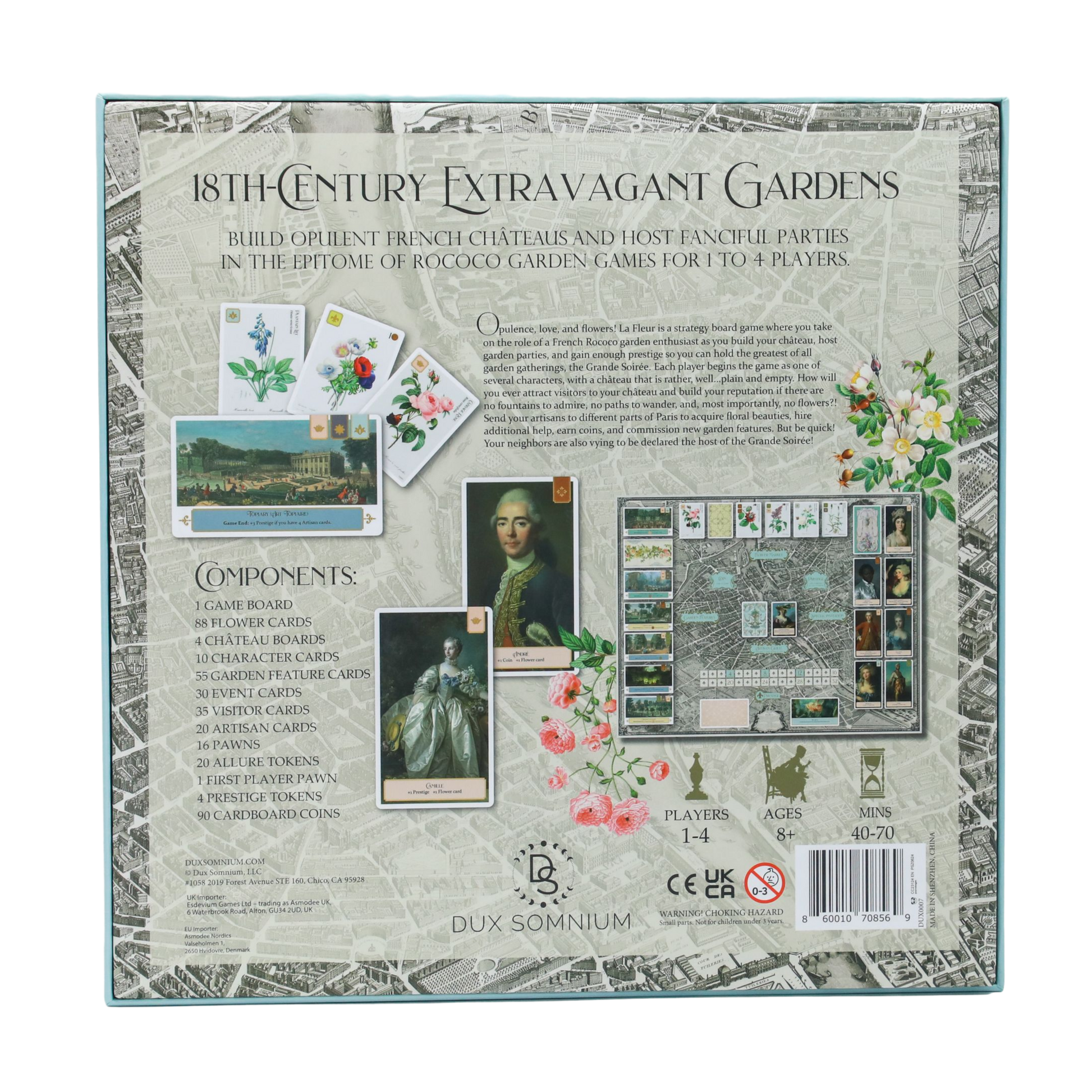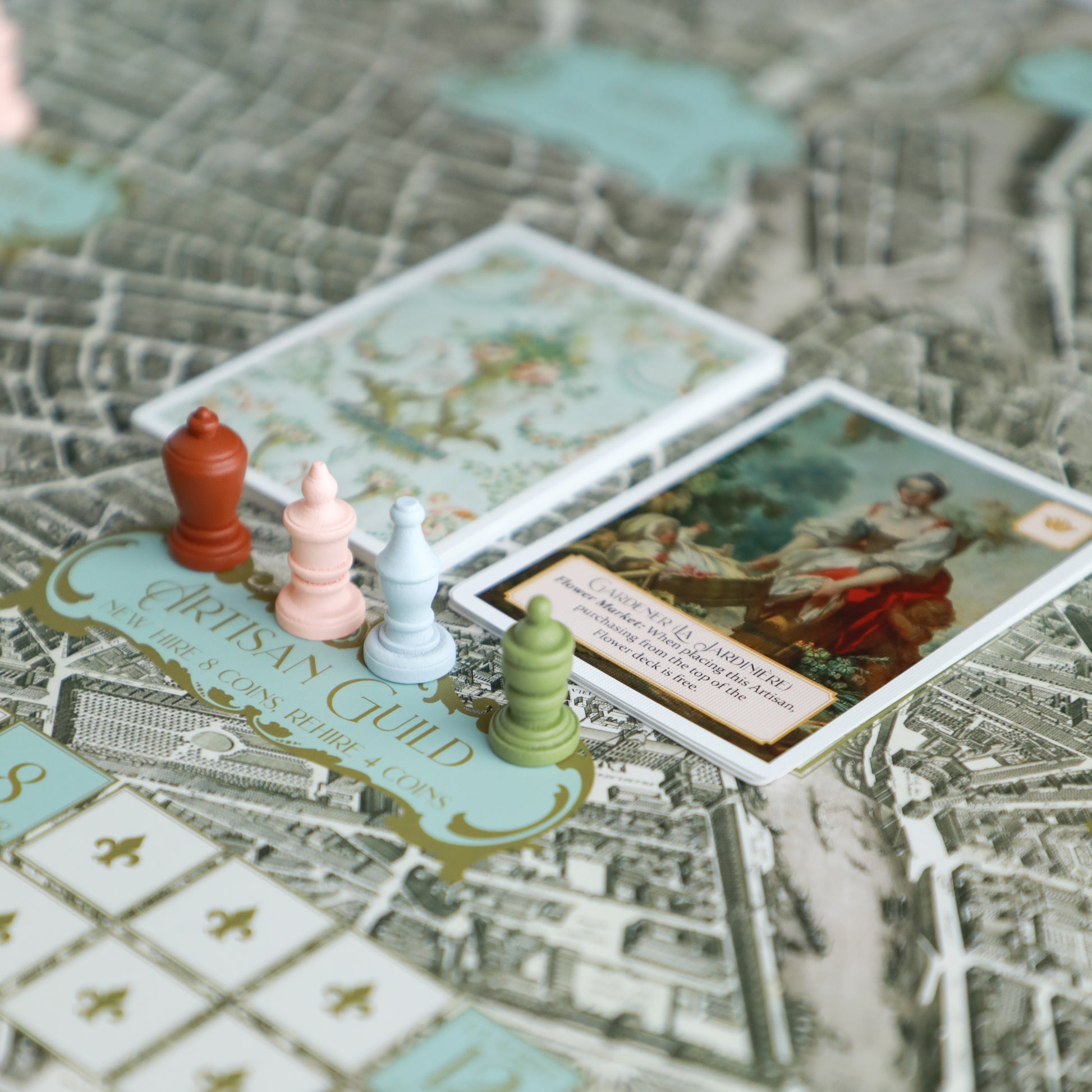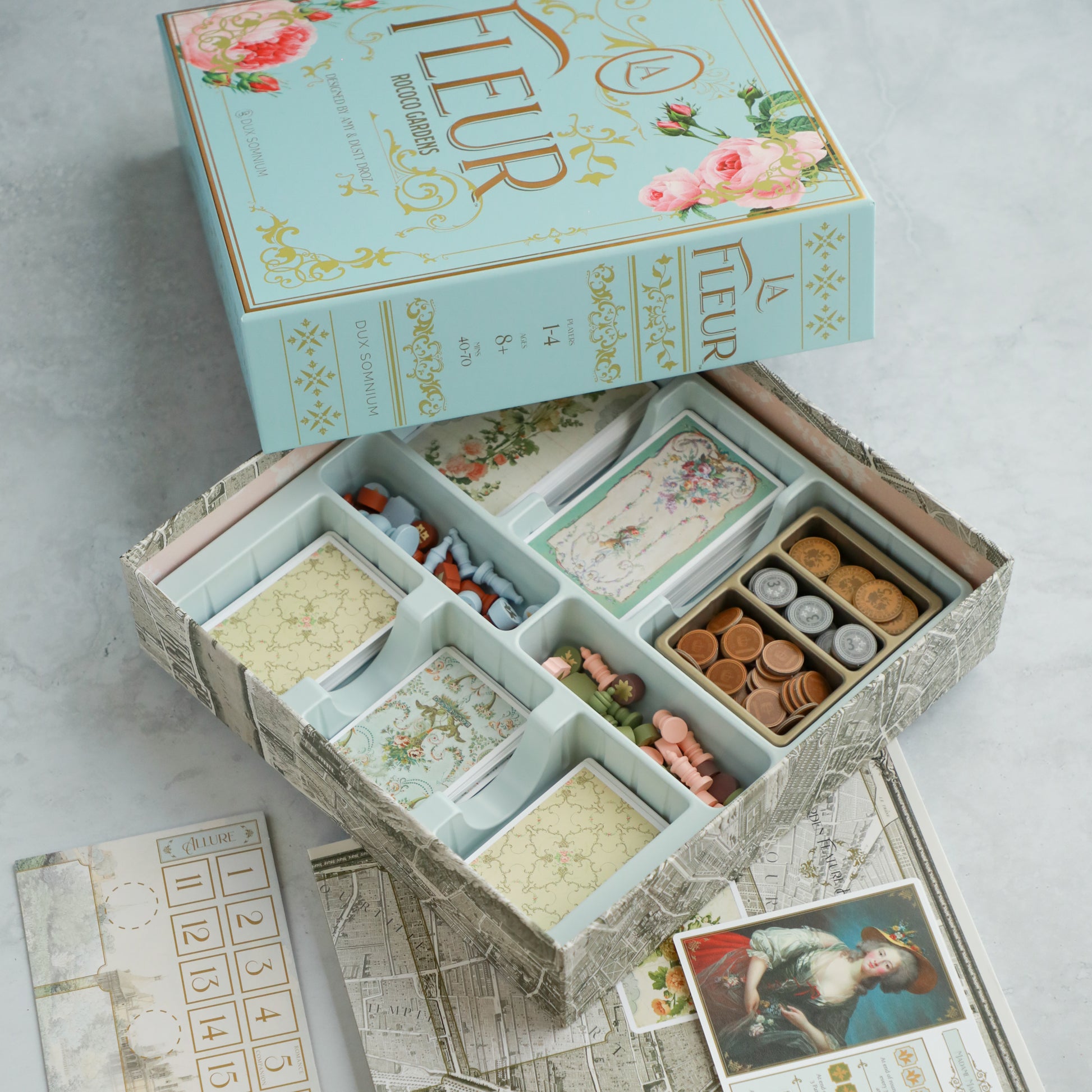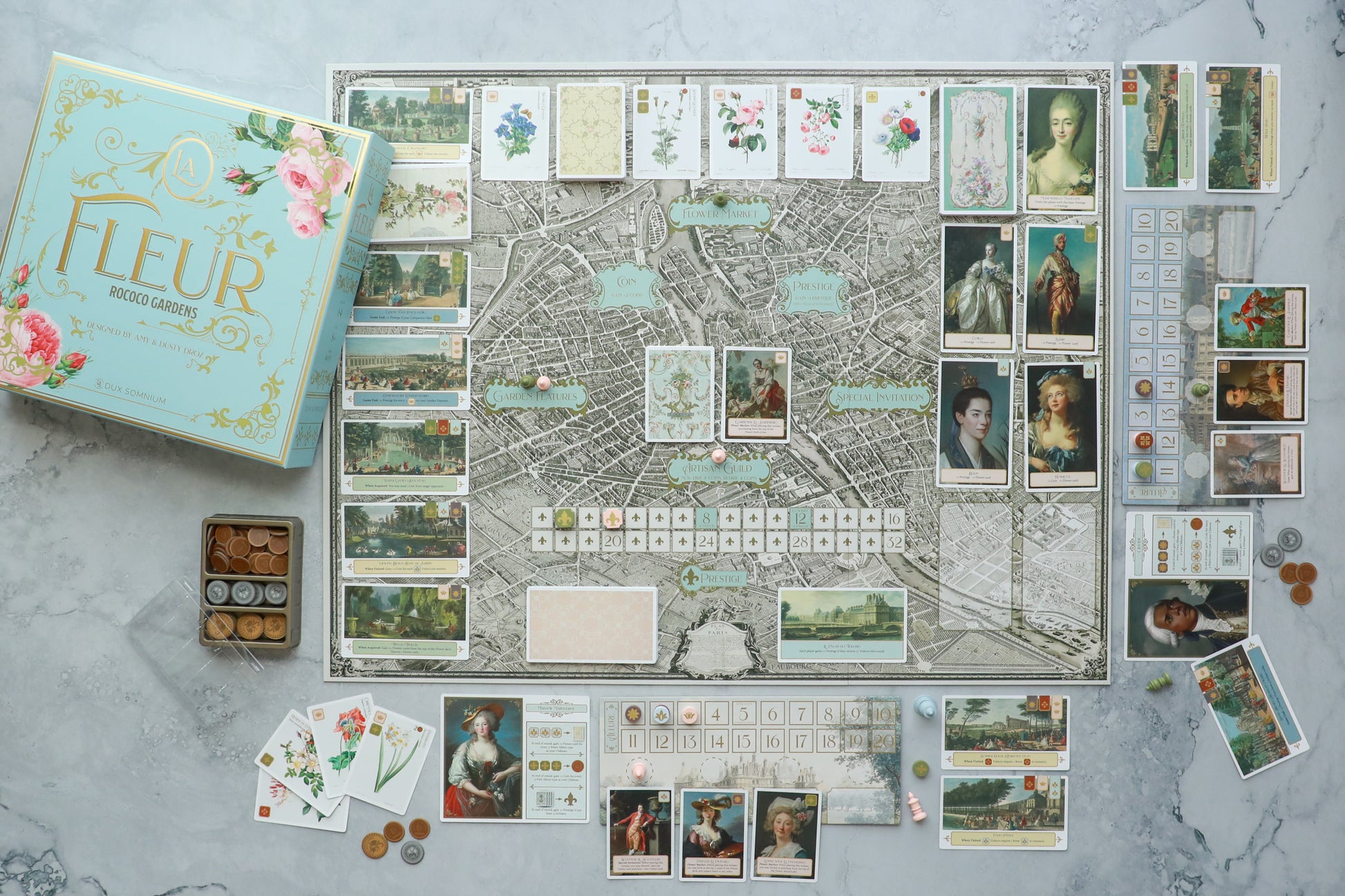 Opulence, love, and flowers! La Fleur is a strategy board game where you take on the role of a French Rococo garden enthusiast as you build your château, host garden parties, and gain enough prestige so you can hold the greatest of all garden gatherings, the Grande Soirée. Each player begins the game as one of several characters, with a château that is rather, well…plain and empty. How will you ever attract visitors to your château and build your reputation if there are no fountains to admire, no paths to wander, and, most importantly, no flowers?! Send your artisans to different parts of Paris to acquire floral beauties, hire additional help, earn coins, and commission new garden features. But be quick! Your neighbors are also vying to be declared the host of the Grande Soirée!